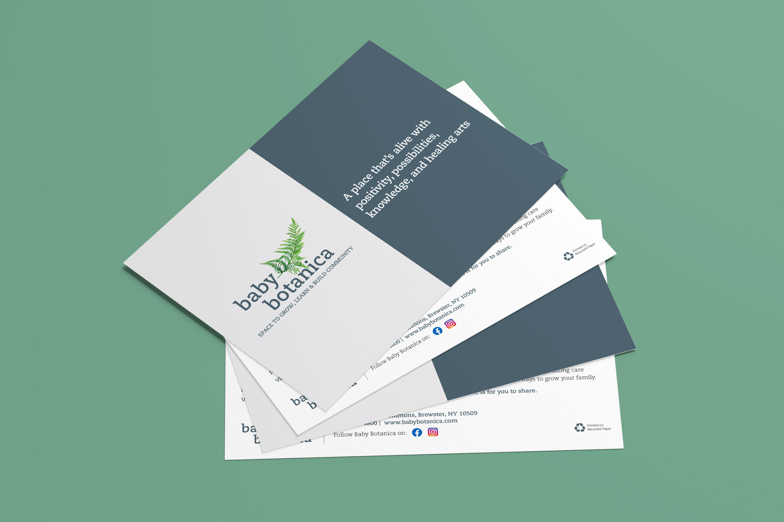 As we were creating logos and bios for the directory, we were also creating base messaging to underlay all communications. We wrote the overview of the services and appeal of Baby Botanica. Individual classes and care professionals were added to the site, Google-appropriate SEO headline structures and meta-tagging were completed and the whole site was connected to a third party booking platform. In order to recruit care professionals, the messaging was quickly translated into oversized postcards to convey the concept and attract interest. As promised the website was delivered on time, all signage was completed and hung. Baby Botanica opened its doors and like any baby, it is growing bigger every day.
