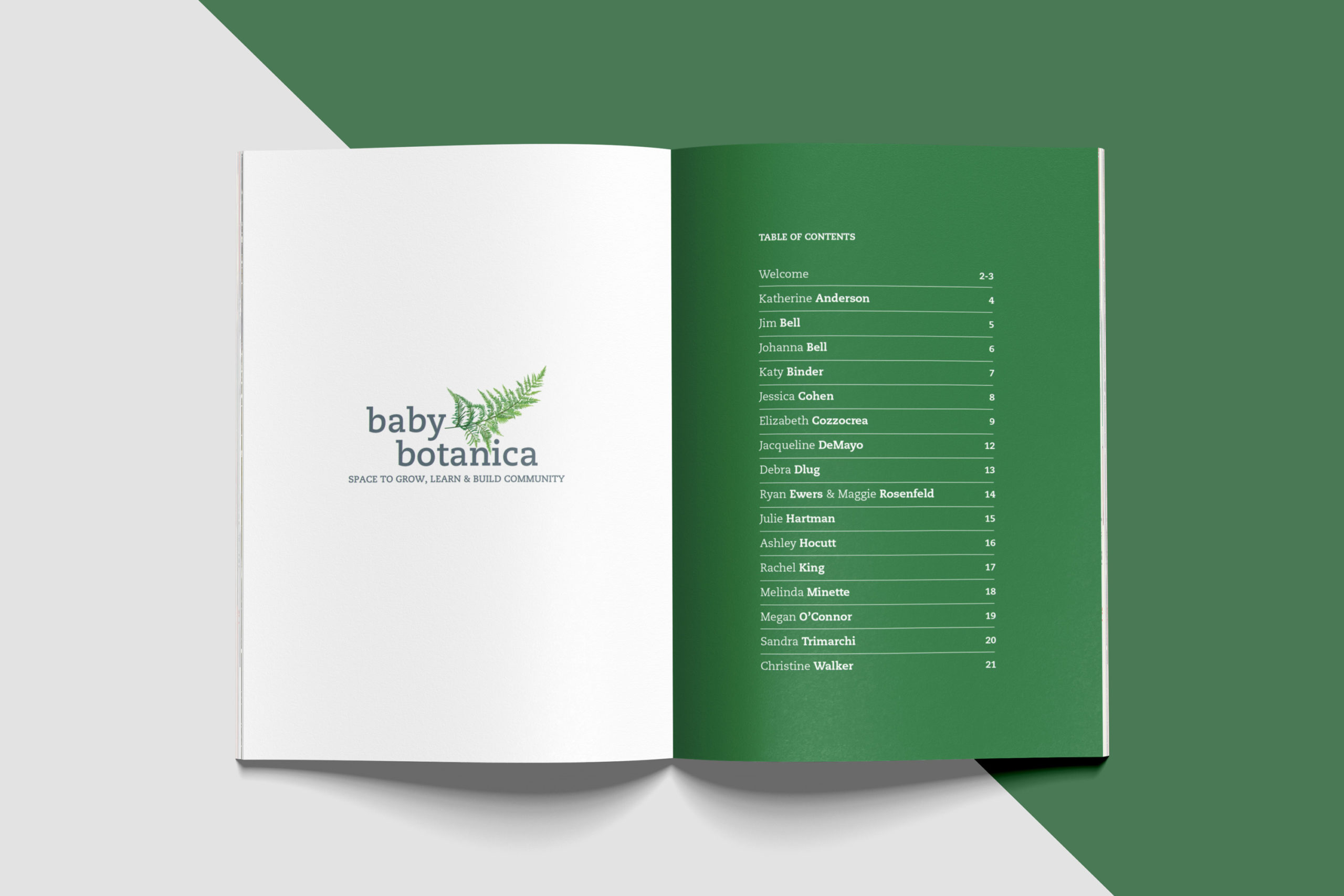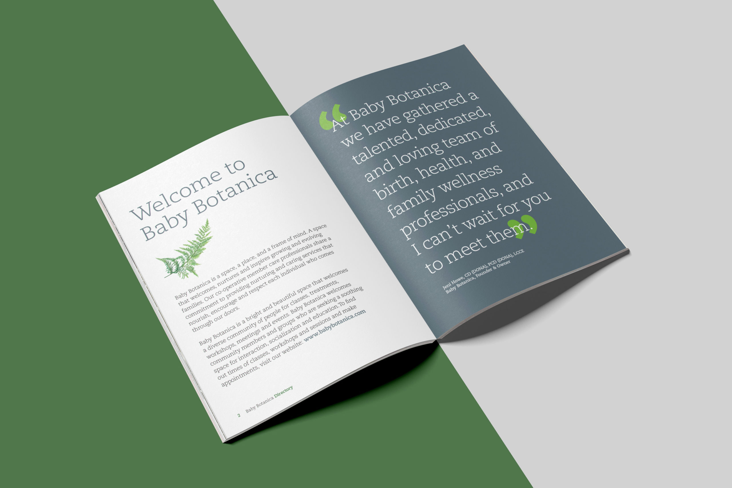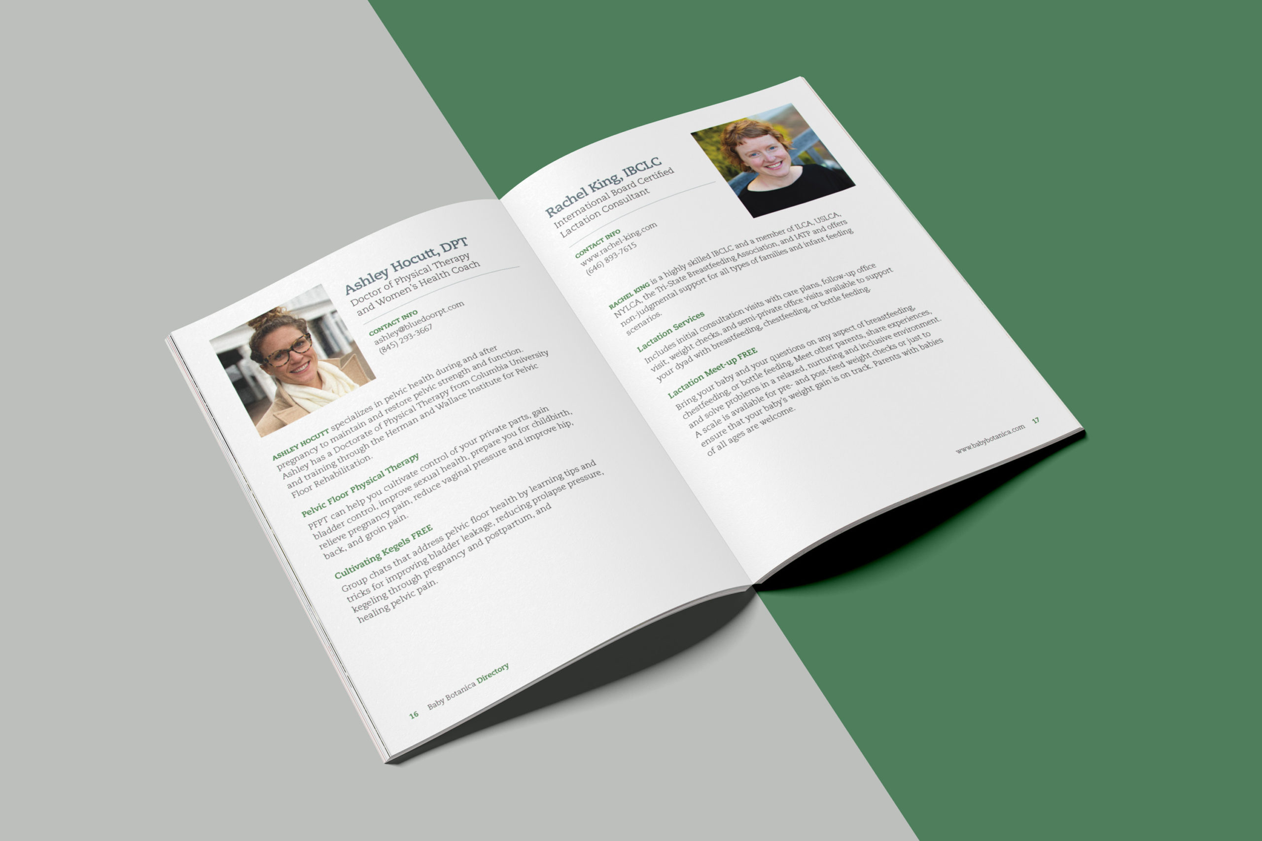 One of the differentiating aspects of Baby Botanica is its structure. It is a specially designed bright and beautiful space that welcomes a diverse community of people for classes, treatments, workshops, meetings and events. Baby Botanica Co-operative care professionals provide emotional, physical and educational support. To present these care professionals to their potential audiences, Ashworth wrote and designed an elegant directory of their credentials, class offerings and more.