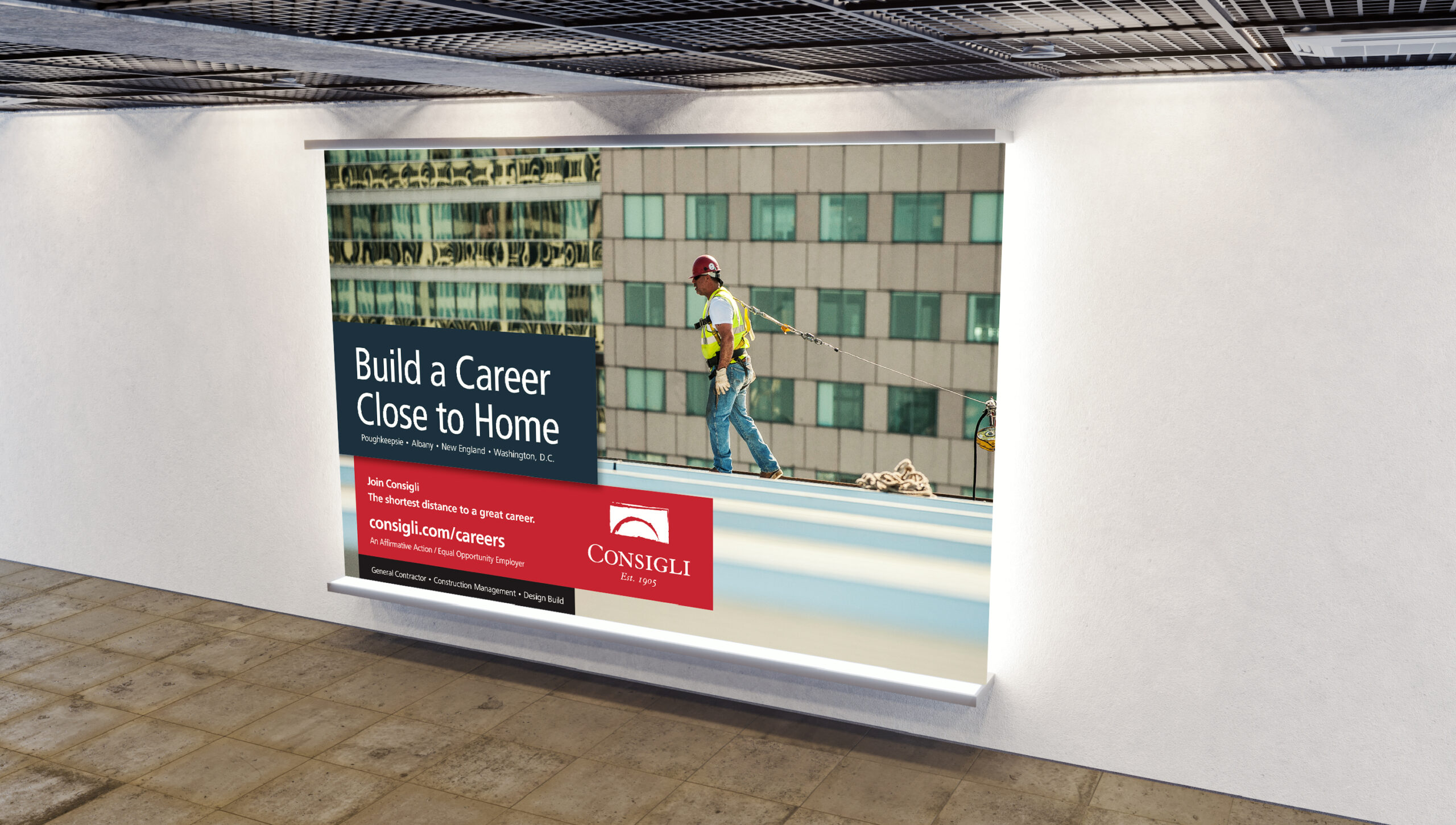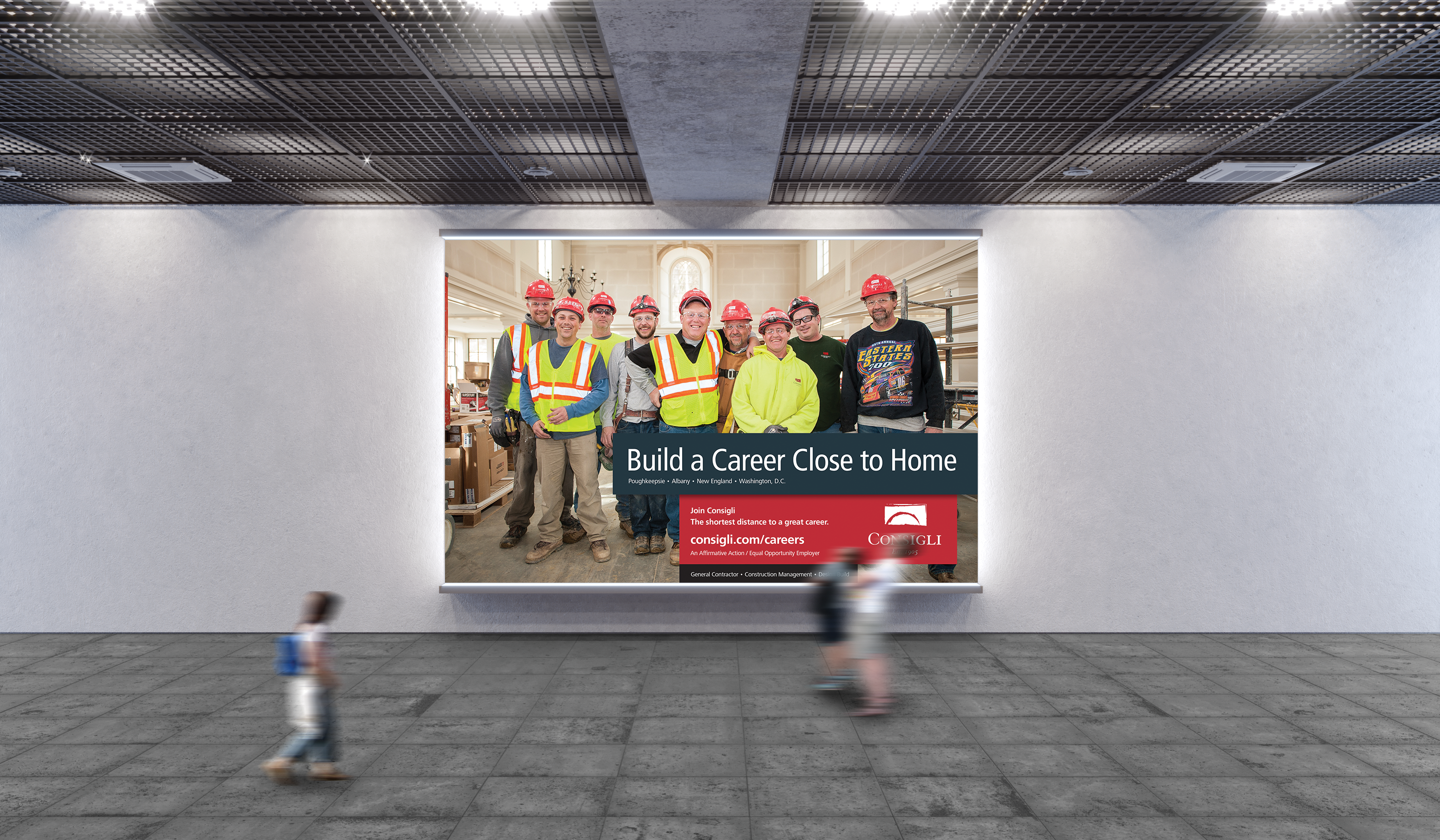 Consigli asked Go Gladys to consider the issue of encouraging talented building professionals to join Consigli Construction instead of traveling to New York City. The natural place to find these prospects is on the two hour train journey to Manhattan and Go Gladys designed and wrote arresting posters to appear in train cars to show that high quality and prestigious construction jobs were available close to home. Backed by the line “Join Consigli. The shortest distance to a great career” the ads dominated the train cars and stood out on platforms.