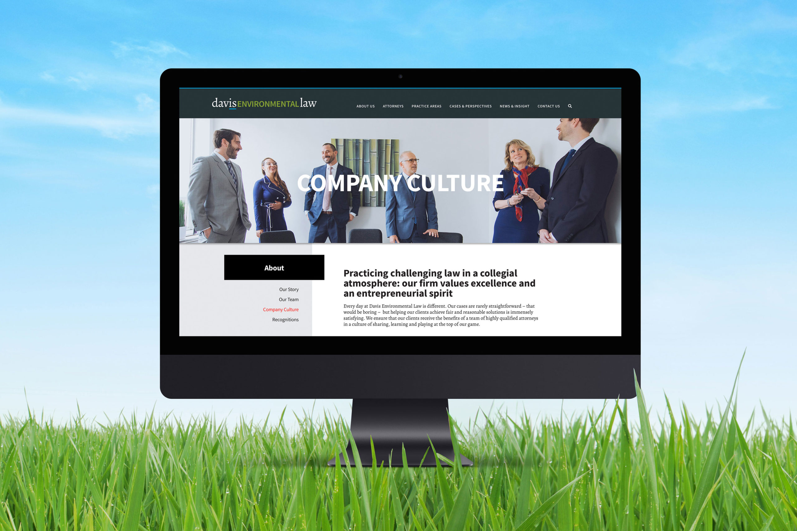 Effective websites are almost always ones that have at least a substantial amount of original photography. Wherever possible, we encourage our clients to add the warmth and humanity of seeing the actual company personnel so that the potential client is not meeting a total stranger at the beginning of an encounter. Go Gladys directed original photography for Davis Environmental Law in their offices to communicate a pleasant, friendly and yet professional approach that will meet client expectations.