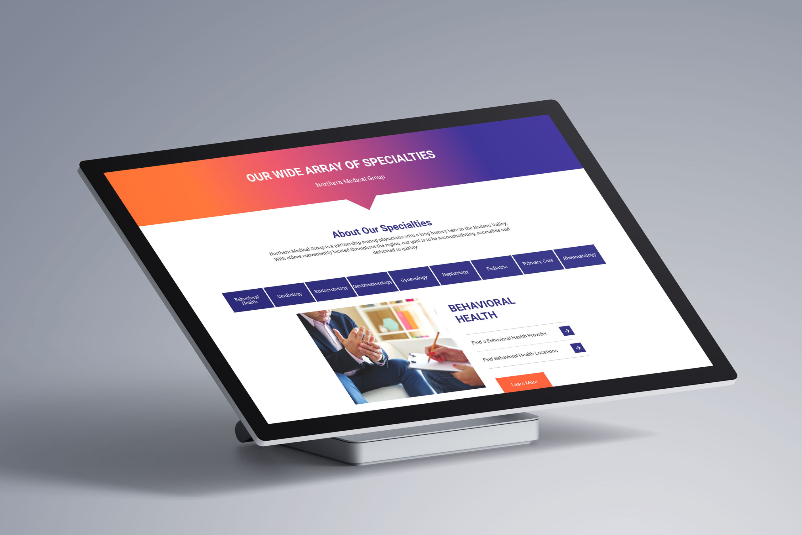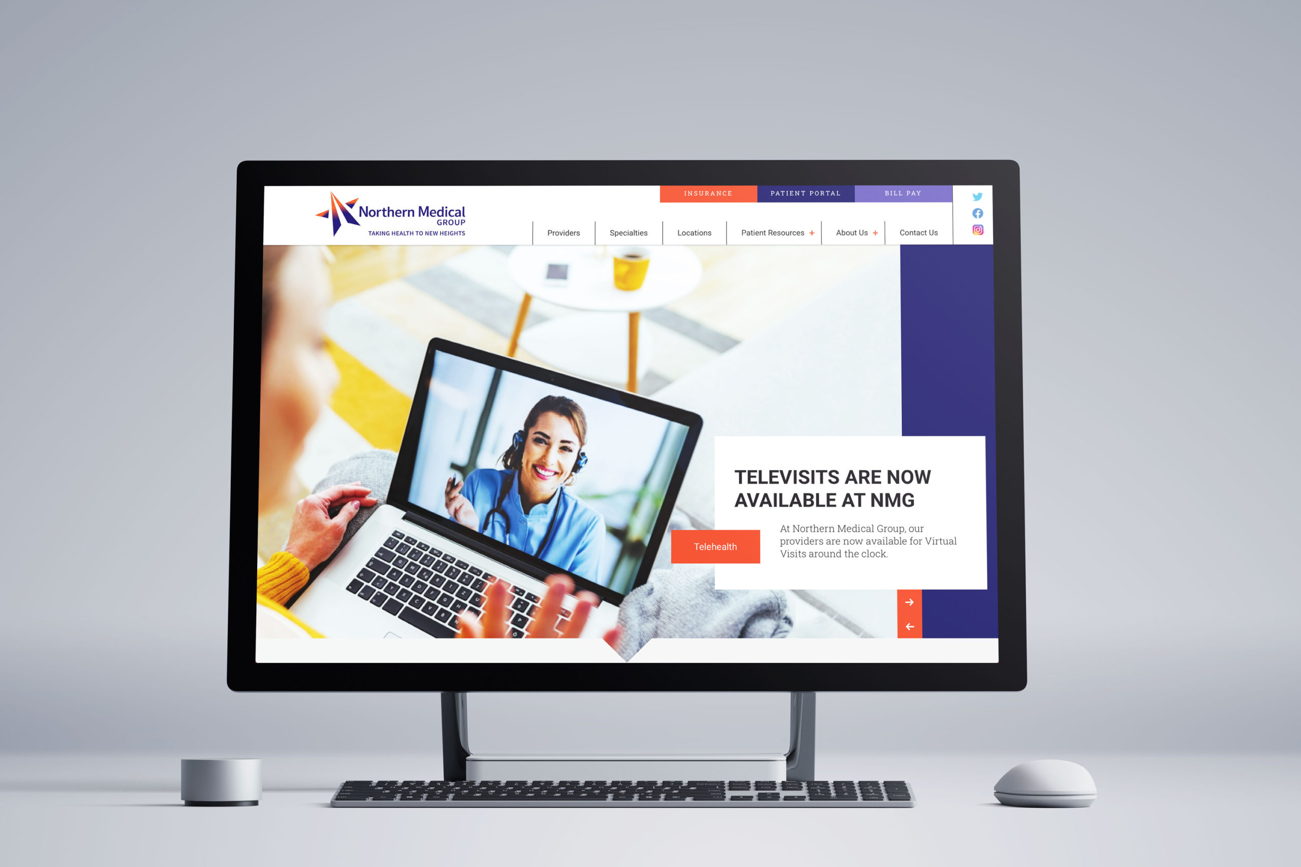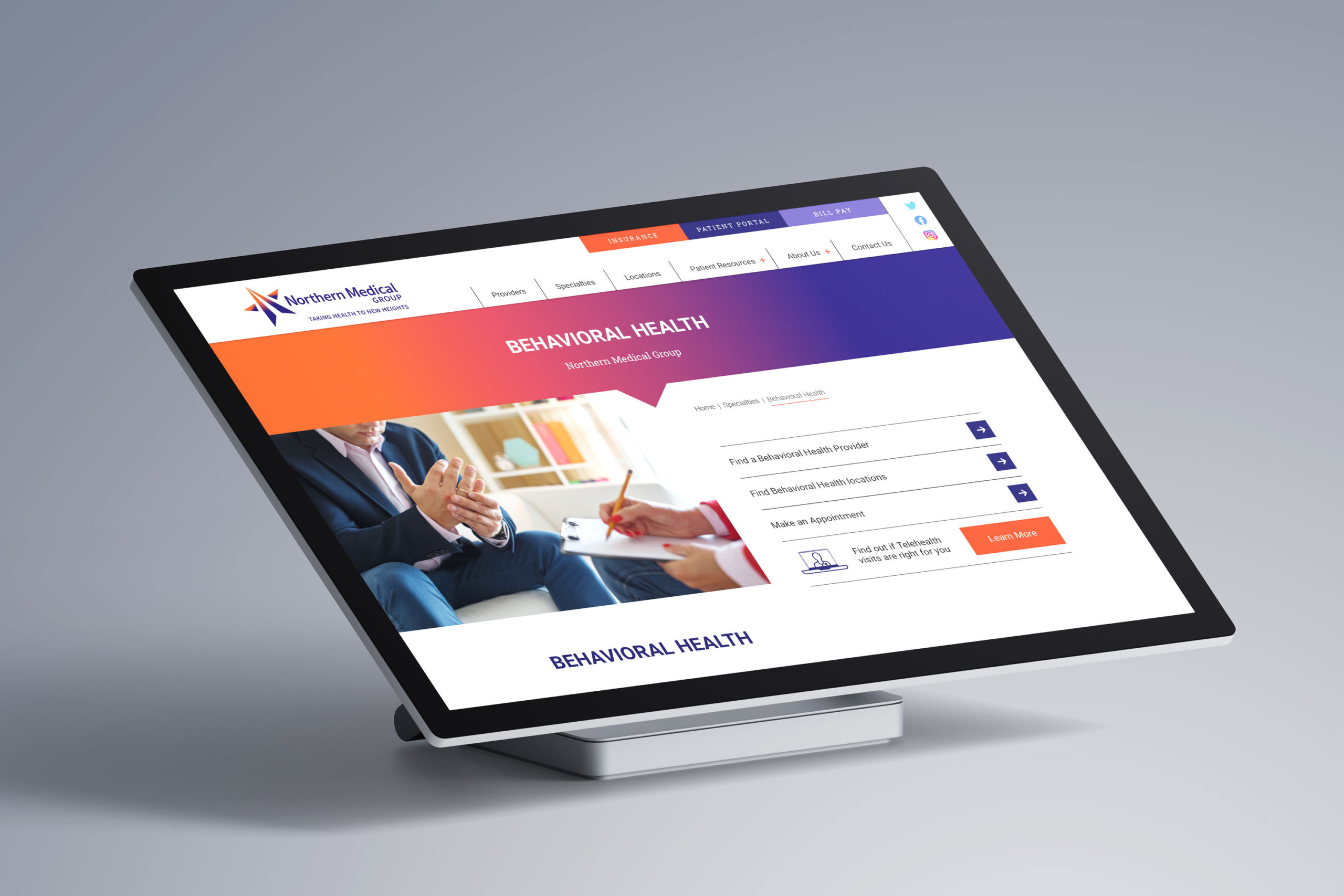 The decision was taken to adopt the name Northern Medical Group as the umbrella name for all three entities. The Go Gladys logo process was adopted and the “rising star” brand mark had a sense of upward movement that felt comfortable to all of the members of the new group. Underscored by the tagline “Taking Health to New Heights,” with a vibrant color scheme of purple and orange, it had a strong, modern and memorable look and feel.